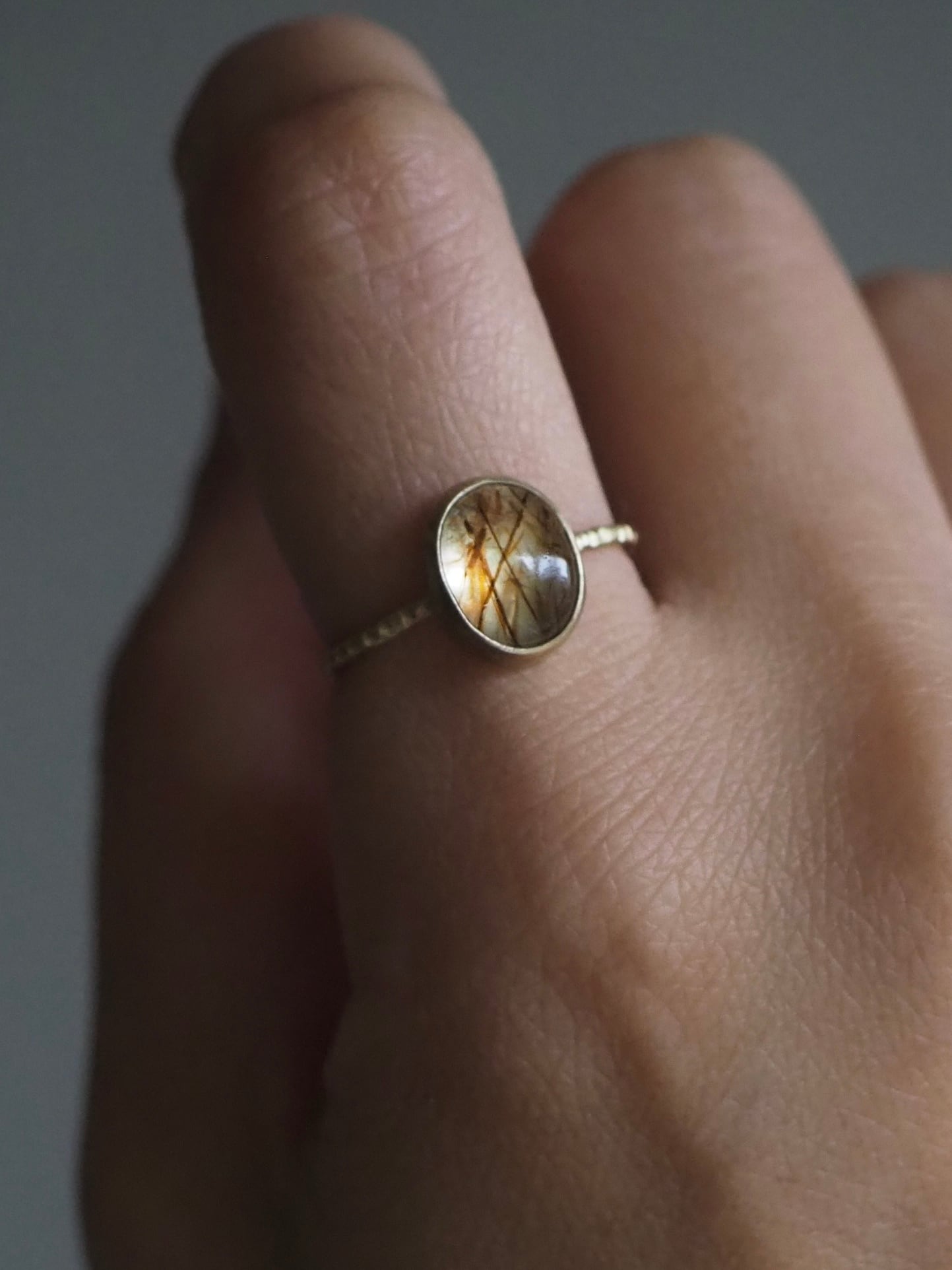 ブラウンの閃光のような透明感のあるMica in Quartzを使用したリング